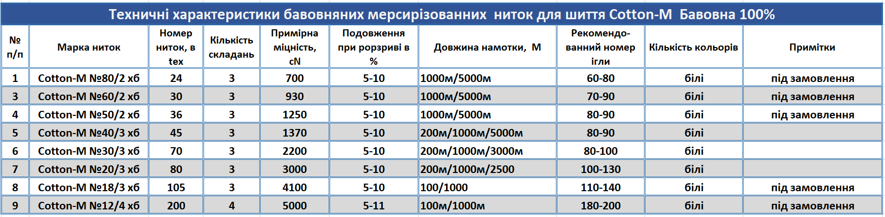 Які номери бавовняних ниток існують: №80х/б (24текс), №60 (30 текс),№50 (36 текс), №40 (Ne 45 tex), №30 (Ne24/3), №20/3 (Ne20/3), №18 (200текс).